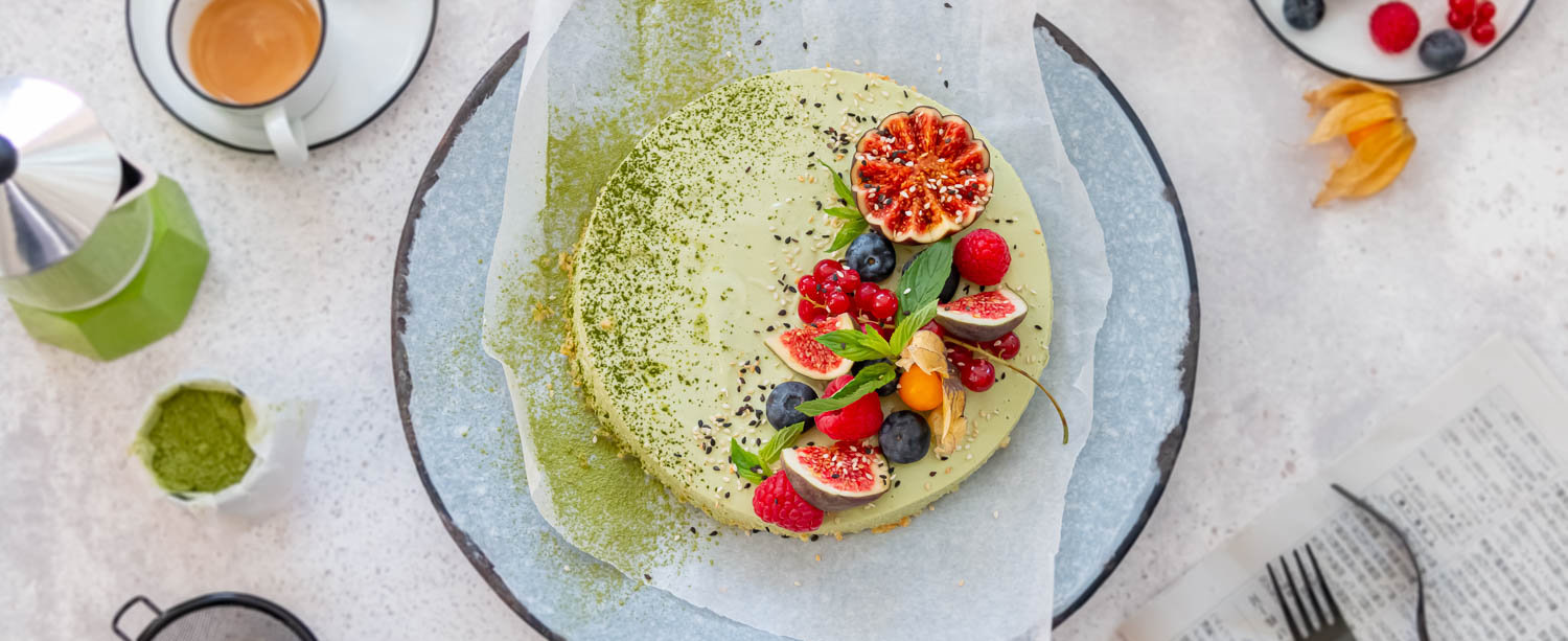 Gelatine in kaltem Wasser einweichen. Philadelphia, Joghurt und Zitronensaft mit dem Handrührgerät vermengen. Matchapulver durch ein feines Sieb geben und mit dem kaltem Wasser anrühren, danach mit heissem Wasser aufgiessen. Jetzt den Zucker und die ausgedrückte Gelatine ins heisse Wasser geben und auflösen lassen. Den Matchatee rasch unter die Frischkäsecrème rühren. Die Masse auf dem Brösel-Boden verteilen und glattstreichen. Die Torte für mindestens 4 Stunden kühlen.