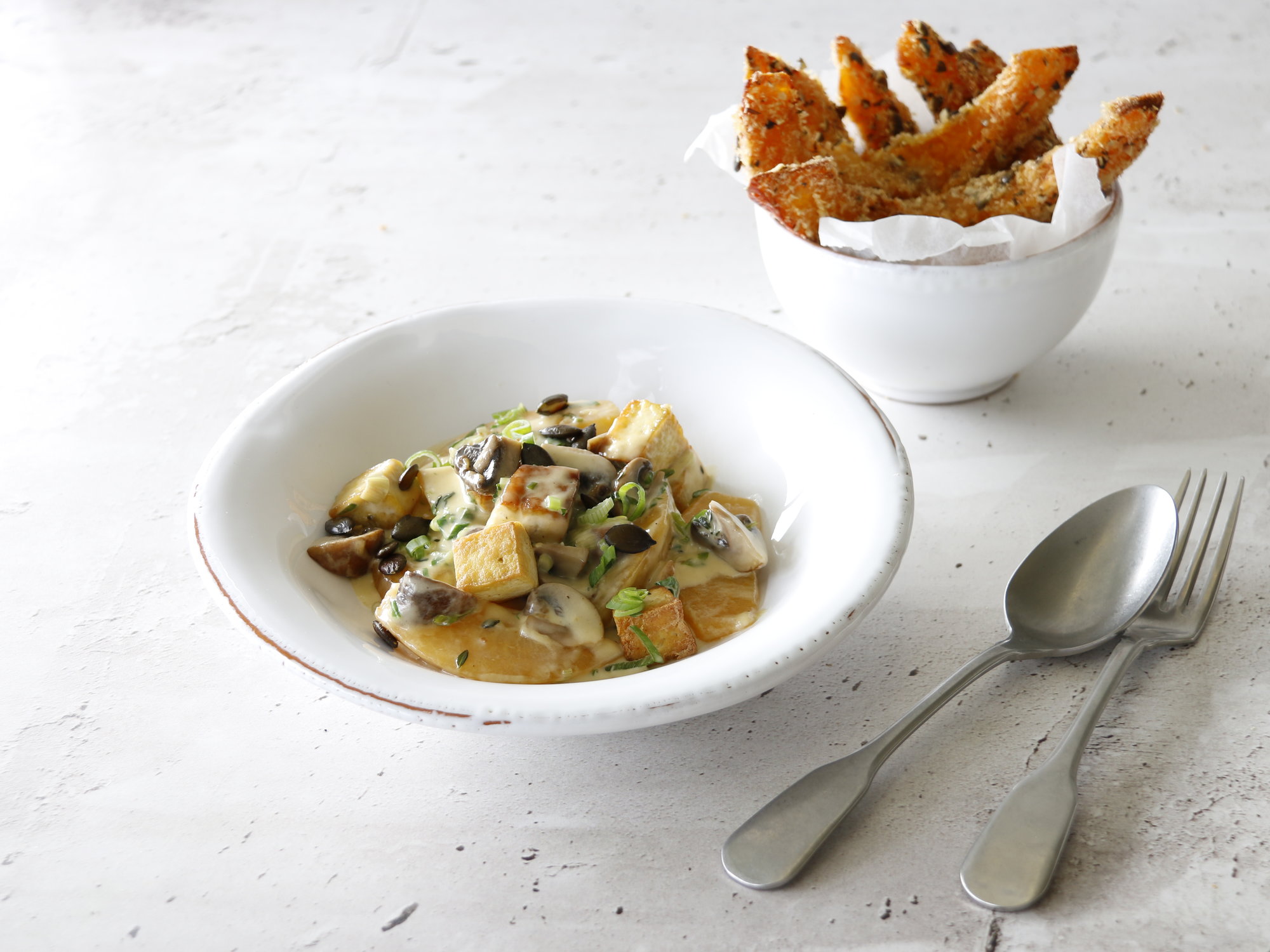 Ragout mit Herbstrübe, Räucher-Tofu, Champignons und Schnittlauch, dazu gebackener Knusperkürbis