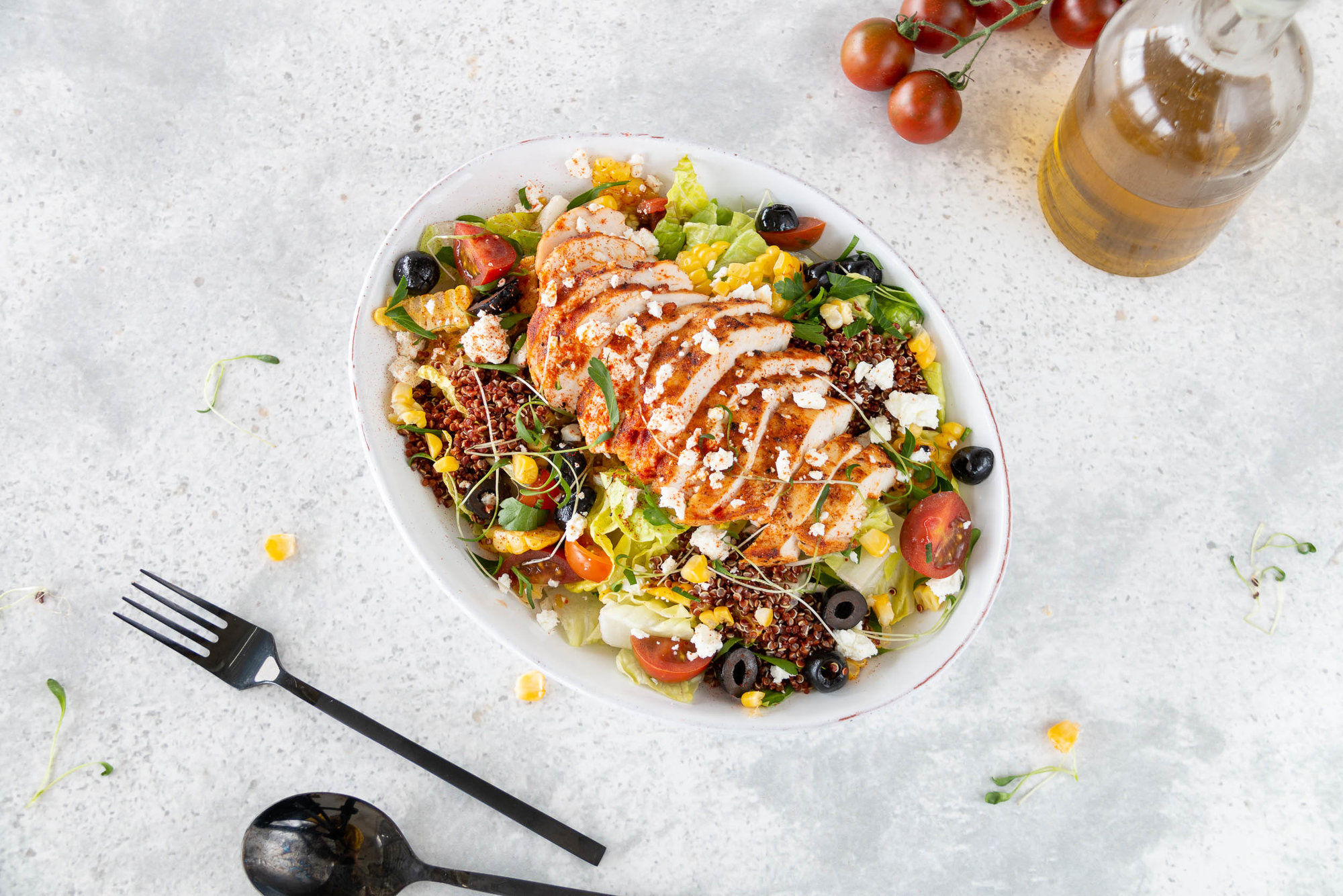Den Lattich gut waschen und schneiden. Die Pouletfilets anbraten und mit Salz, Pfeffer und Rauchpaprika würzen. Den Quinoa nach Packungsangabe kochen. Die Cherrytomaten halbieren. Die Oliven entsteinen und klein schneiden. Mais, Tomaten, Oliven und Quinoa mischen und zum geschnittenen Lattich geben. Das Poulet in Streifen schneiden und auf den Salat legen. Den Feta mit der Hand über den Salat bröseln. Mit dem Dressing anrichten.