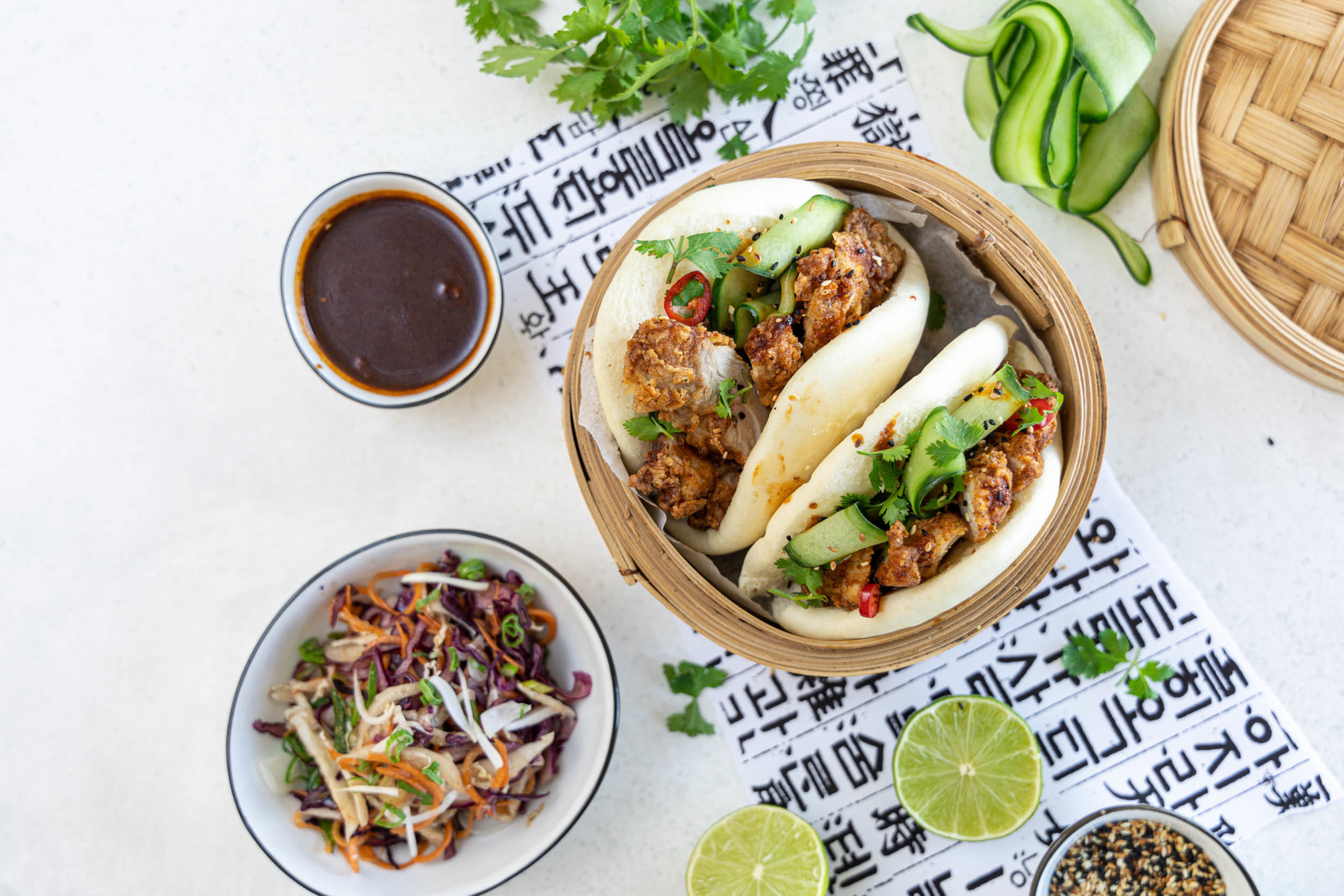 Die Gurken mit dem Sparschäler in feine lange Streifen schälen. Den Sesam in einer Pfanne ohne Öl ganz kurz anrösten. Das Poulet kurz vor dem Servieren in der Gochujang-Sauce wenden und zusammen mit dem Koriander und den Gurken in die Buns füllen. Mit Sesam bestreuen und mit dem Kohlsalat anrichten.