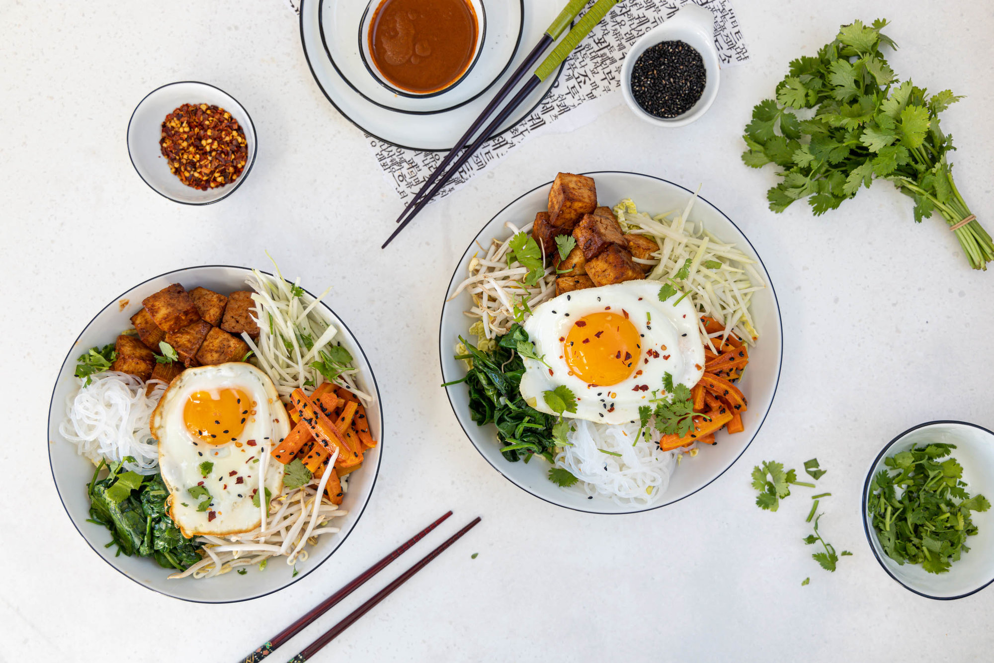 Die Nudeln kurz im heissen Wasser erwärmen (kann man aber auch kalt essen) und mit etwas Sesamöl und Salz abschmecken. Eine Bratpfanne mit etwas Rapsöl erhitzen, die Eier vorsichtig hineingeben, zu Spiegeleiern braten und mit Salz und Peffer abschmecken. Den Koriander grob schneiden.