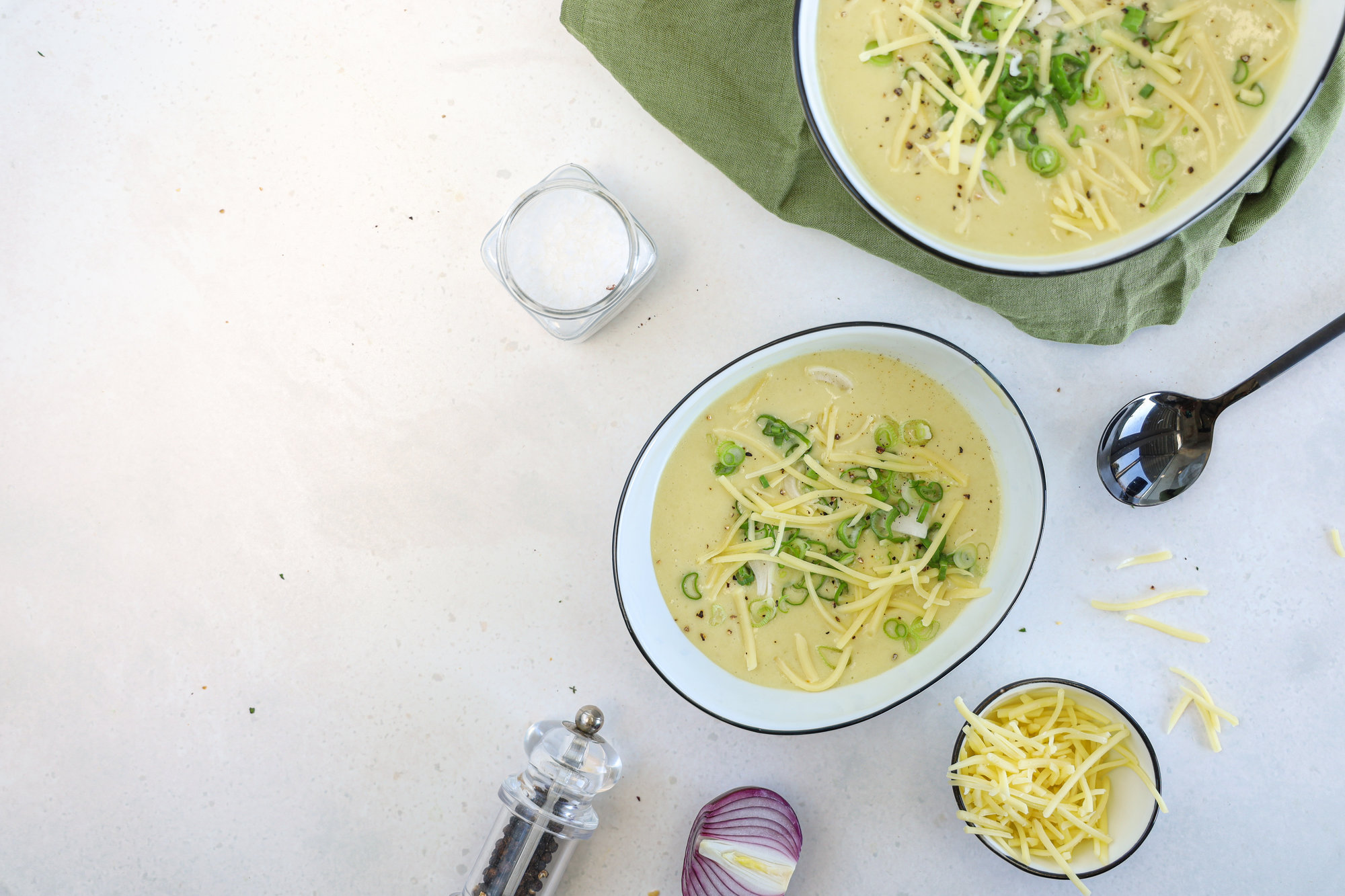 Die Suppe mit Blanc battu, Cheddar-Käse und gehackten Frühlingszwiebeln garnieren.