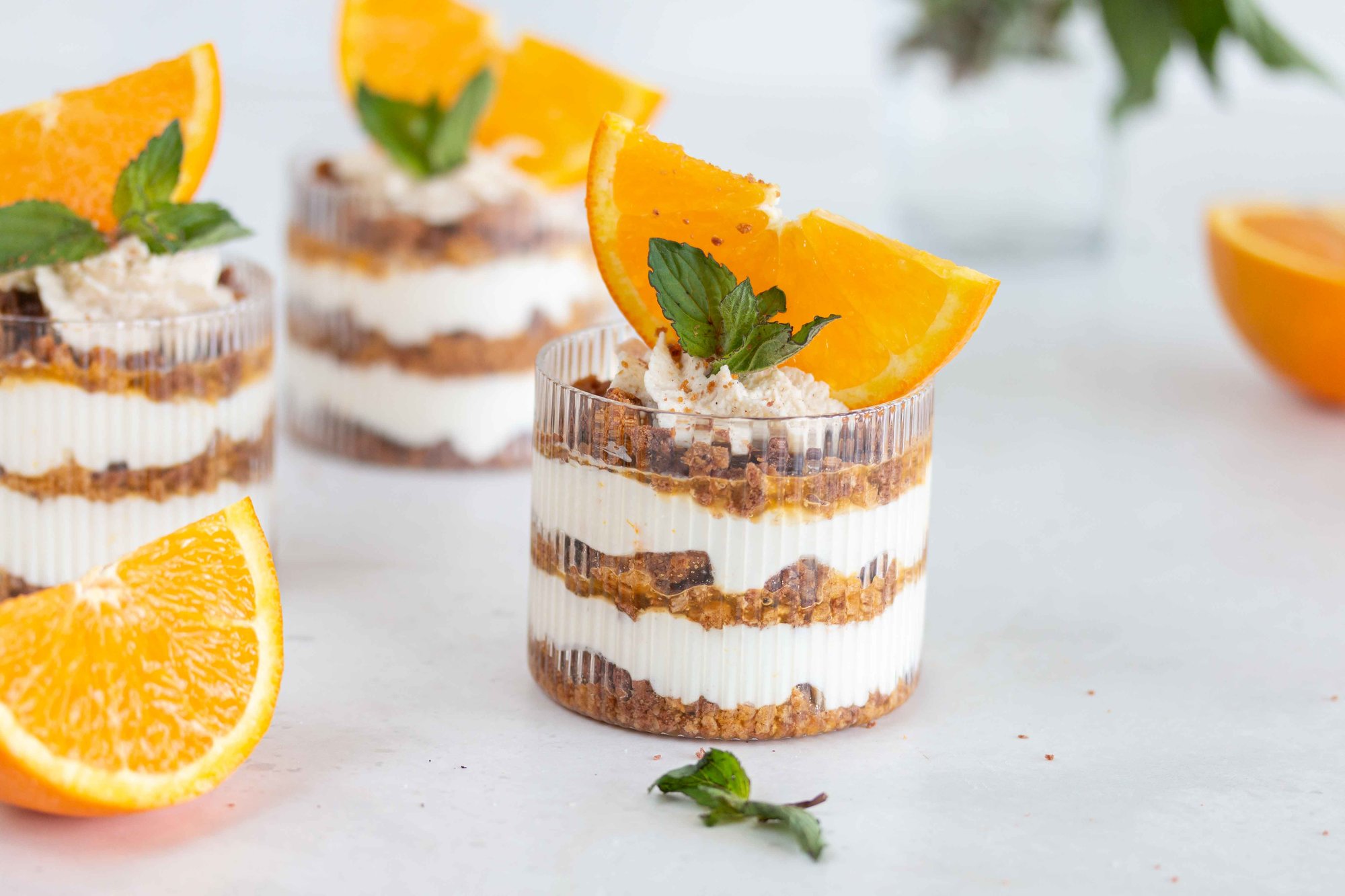 Den Magerquark mit Zucker und der Zeste der ganzen Orange vermengen. Die Orange halbieren und eine Hälfte auspressen. Etwa 2 EL Saft zum Quark geben. Den Vollrahm schlagen und 3/4 davon dem Quark unterheben. Den Lebkuchen "verbrösmeln". Die Lebkuchenrösel und Quarkcrème abwechselnd in 8 Gläser füllen. Den restlichen Schlagrahm mit etwas Zucker und Zim vermischen. Die zweite Orangenhälfe in feine Scheiben schneiden. Die Gläser dann mit dem Zimtrahm und je einer Orangenscheibe garnieren. Dazu passt auch noch einige Pfefferminz-Blätter.