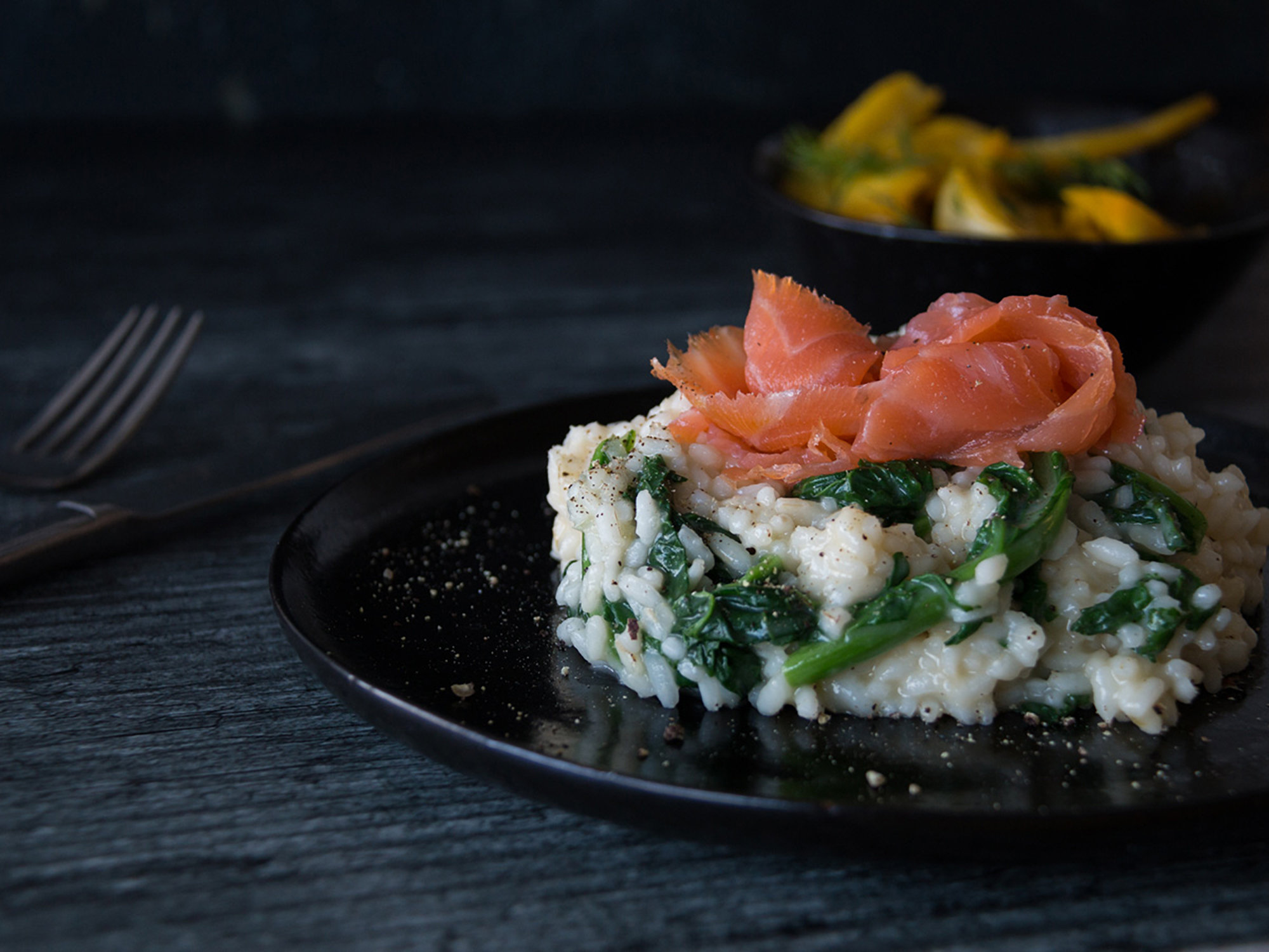 Prosecco-Risotto mit Cima di rapa, Safranfenchel, Kanada-Rauchlachs