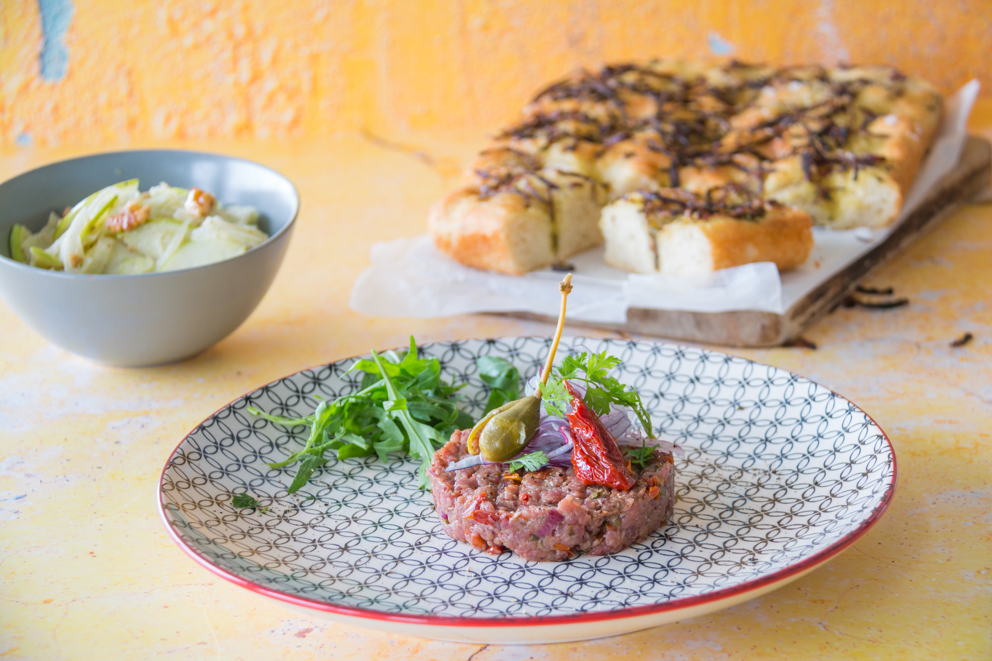 Carne cruda vom Rind, Kräuter-Focaccia, knackiger Fenchel-Apfel- Salat mit Baumnüssen und Honig