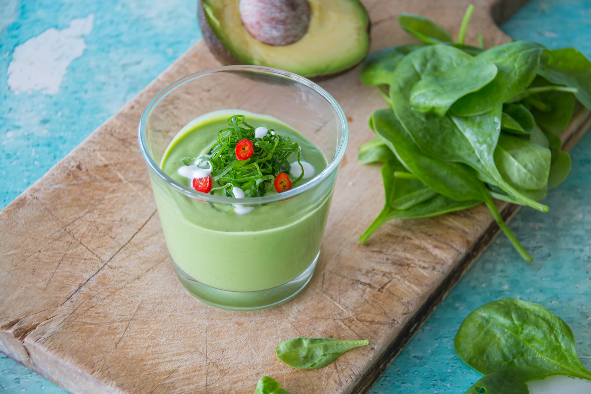 Avocados schälen und Kern entfernen. Den Spinat waschen, den Apfel entkernen. Alles ausser dem Grün der Frühlingszwiebel in den Mixer geben und glatt pürieren, eventuell mit Wasser verdünnen. Abschmecken und mit in Ringe geschnittenen Frühlingszwiebelgrün garnieren.