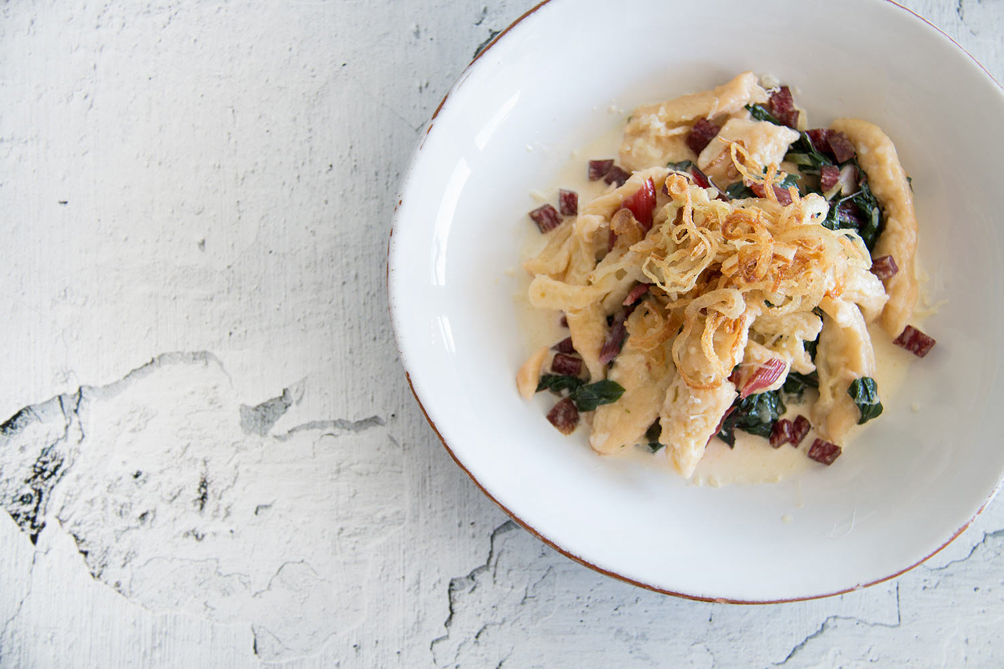 Pizokel mit feinem Engadiner Salsiz, buntem Krautstielgemüse, Bündner Bergkäse und Knusperzwiebeln