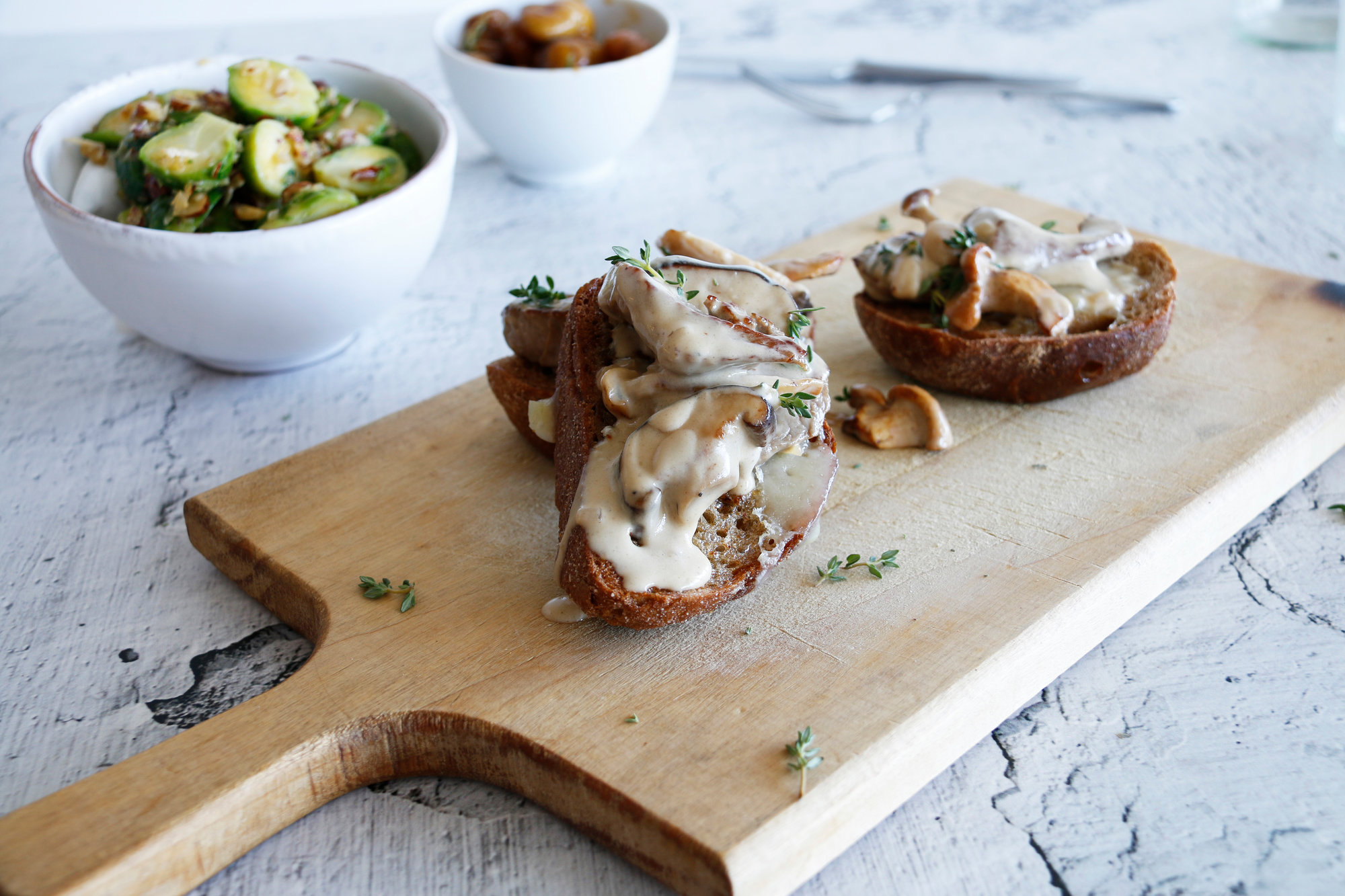 Älpler Schnitte – Geröstetes Ruchbrot mit geschnetzeltem Kalbfleisch und Waldpilzen, glasierten Rosmarin-Marroni und Rosenkohl mit Haselnussbutter