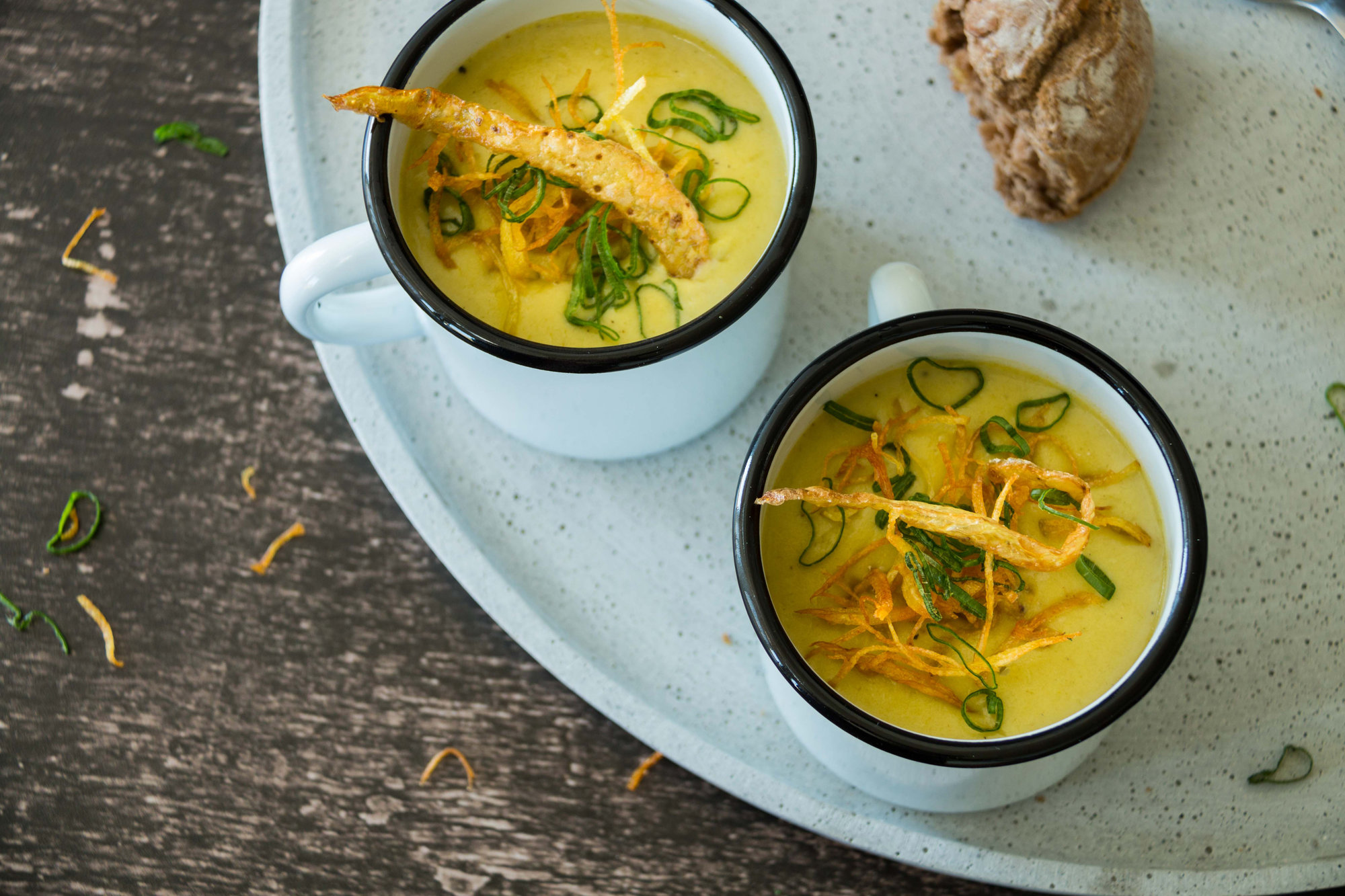 Butter schmelzen, das Weisse der Frühlingszwiebel und den Knoblauch darin glasig dünsten. Lauch zugeben und mitdünsten, mit Bouillon auffüllen. Kartoffeln und Thymian beigeben, köcheln lassen bis alles weich ist. Rahm dazugeben, Suppe mixen und abschmecken, mit Frühlingszwiebelgrün und frittierten Kartoffelstreifen garnieren.