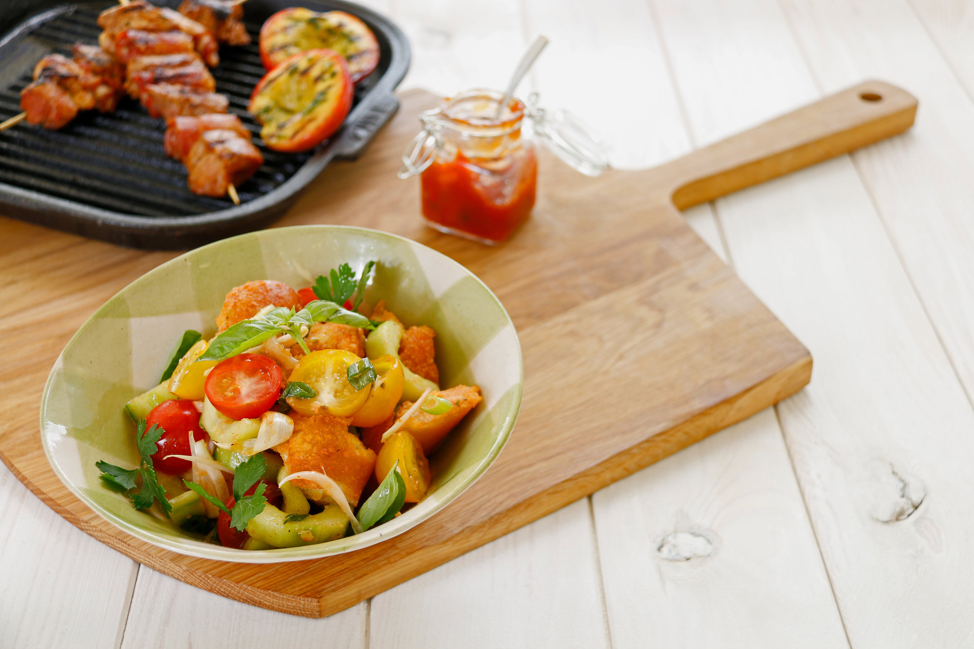 Zigüüner-Spiess mit Renés BBQ Salsa, Panzanella-Brotsalat, gegrillte Nektarinen mit Basilikum-Pesto