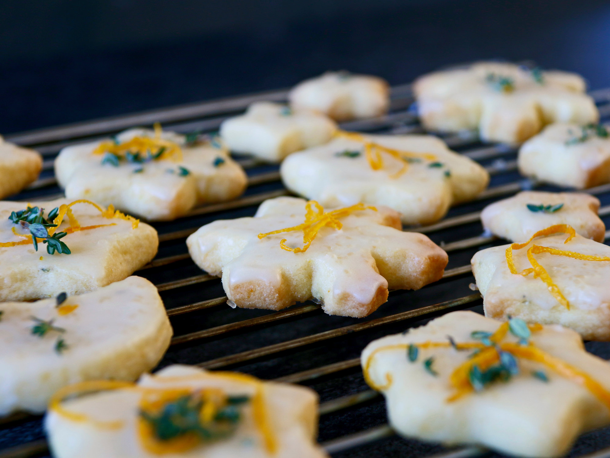 Butter schaumig rühren. Zucker und Salz unterrühren. Eigelb beigeben und weiterrühren, bis die Masse hell ist. Orangensaft und -abrieb beigeben. Thymianblätter zupfen, grob hacken und unterrühren. Mehl beigeben und zu einem Teig zusammenfügen. Teig in Klarsichtfolie wickeln, etwas flach drücken und 30 Minuten kühlstellen. Teig auf einer bemehlten Arbeitsfläche 5 mm dick ausrollen. Mit Sternförmchen Guetzli ausstechen und mit genügend Abstand auf mit Backpapier belegte Backbleche legen. Im vorgeheizten Ofen bei 170 Grad Umluft 10–12 Minuten goldbraun backen. 10 Minuten auf den heissen Blechen ruhen lassen, dann auf einem Gitter auskühlen. Für die Glasur den Puderzucker mit Orangensaft verrühren und die Guetzli damit bestreichen, mit gezupften Thymianblättchen garnieren.