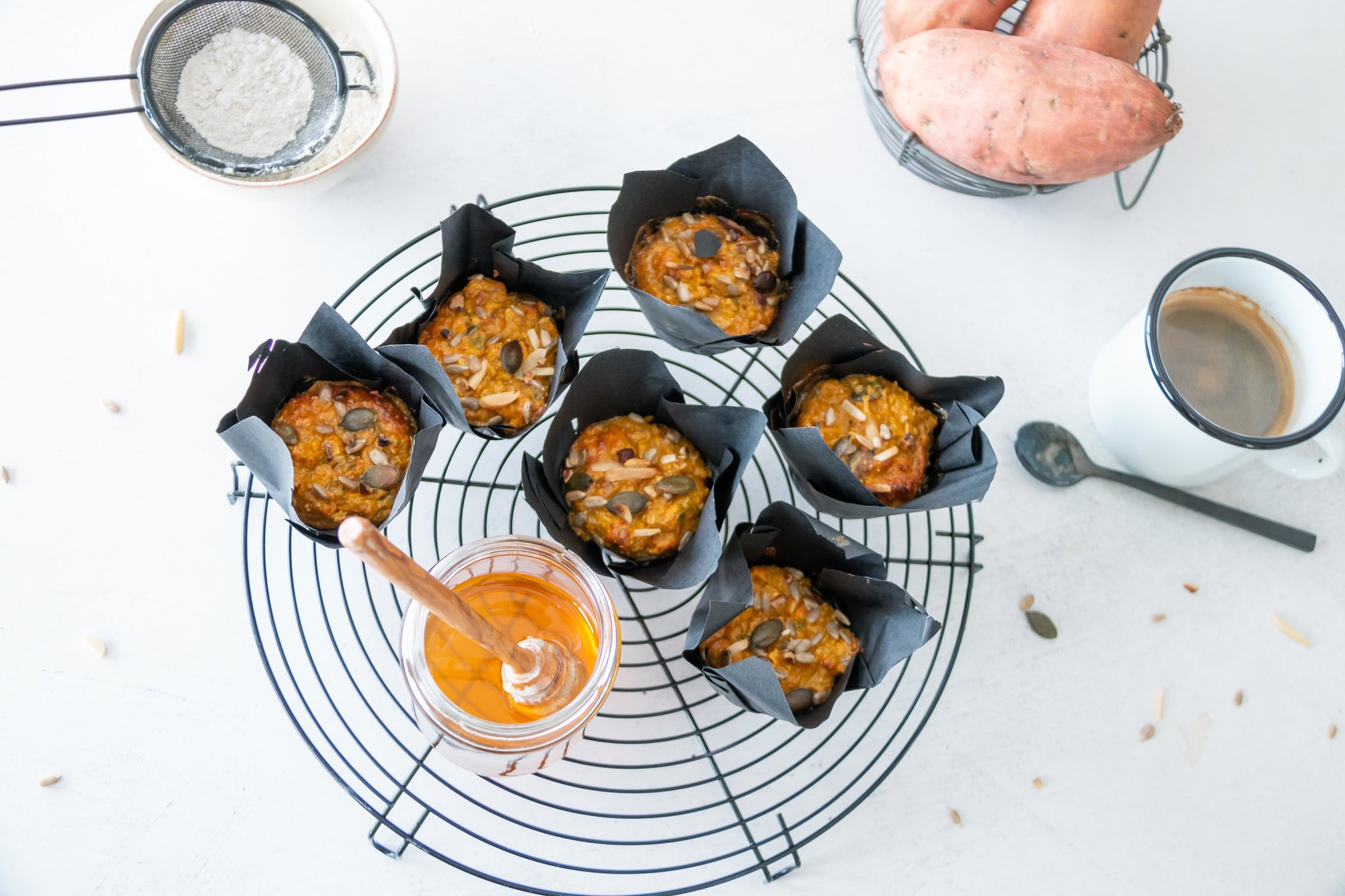Die Haferflocken mit der Hafermilch vermischen und 5 – 10 Minuten quellen lassen. Chili und Frühlingszwiebel kleinschneiden und mit den restlichen Zutaten vermengen. Die Masse mit den Haferflocken vermischen. Die Eier kurz aufschlagen und den Magerquark dazugeben. Die restlichen Zutaten langsam unterheben. Dann die Süsskartoffel-Haferflocken-Mischung dazumischen. Die Masse in die Muffinförmchen geben und bei 180 Grad (Umluft) ca. 15 Minuten backen. Die Masse darf noch leicht weich und feucht sein, wenn man sie aus dem Ofen nimmt.